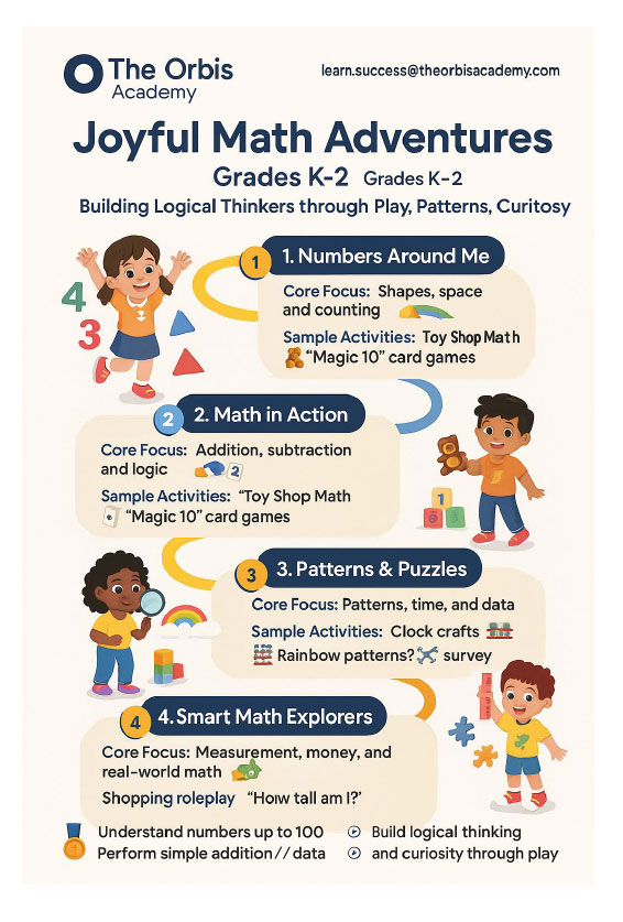 At The Orbis Academy, we believe every child is born curious. This program transforms math from a subject into a story โ where students count with creativity, solve with logic, and play with purpose.