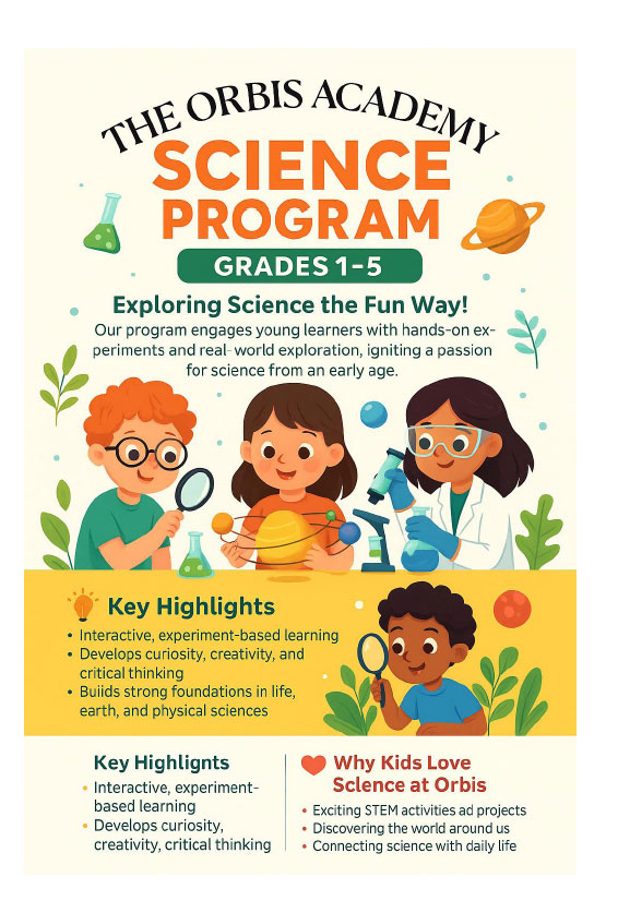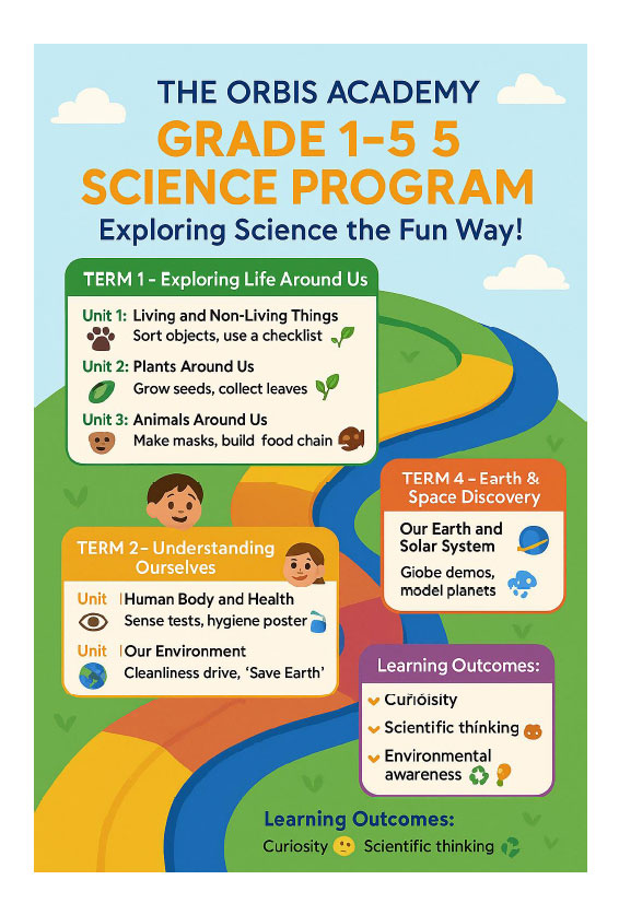 The Orbis Academy Grade 1–5 Science Program is designed to engage young learners in hands-on exploration, fun experiments, and curiosity-based discovery. Students learn Science the joyful way—through observation, creativity, and real-world connections.
